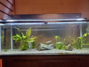 釣り好きの料理長がついに大型水槽を店玄関に設置しました。今水槽にいるのはオイカワという淡水魚で、料理用ではなくて観賞用です。近いうちに、鮎やコイ科の淡水魚で最も美味といわれている琵琶湖産のホンモロコをこの水槽に入れてお客様に提供する予定です。今のところは、お取り寄せしたホンモロコを天ぷらや唐揚げや南蛮漬けにしたものを新メニューとして提供を始めています。城山旅館のジビエ料理は既に周知され、多くのお客様から高評価もいただいてご利用いただいていますが、この新しく加えた魚料理をぜひ一度ご賞味ください。